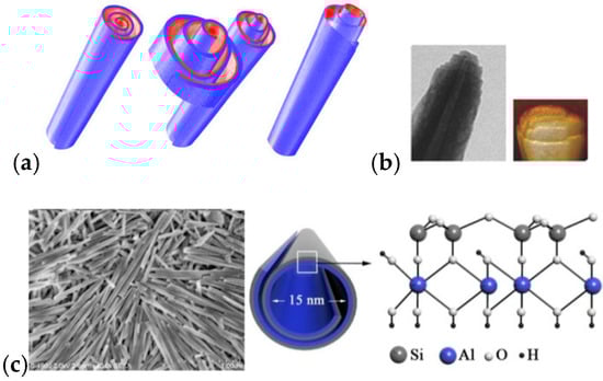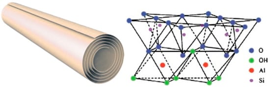 Schematic representation of the rolled structure of halloysite (left) and schematic illustration of the crystalline structure of halloysite (right). Reproduced with permission from [89].