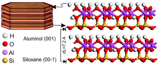 The interlayer space of 1:1 clay mineral is about 7.2 Å, a value lower than the 2:1 clay mineral. It is little expandable due to the strong hydrogen bond in the interlayer space, allowing only few water molecules or cations to enter the structure (Figure 4). The more available surface is the external one, with an overall surface area limited to 10–30 m2 g−1 [21,22].