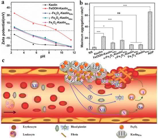 (a) ζ–potential curves of kaolin, FeOOH–kaolinKAc, α–Fe2O3–kaolinKAc, γ–Fe2O3–kaolinKAc, and Fe3O4–kaolinKAc. (b) Platelet aggregation induced by the samples, normal saline, and ADP represented as the maximal percentage aggregation of sodium citrated treated whole blood. (c) Illustration of the presumed synergism of α–Fe2O3–kaolinKAc composite in hemostasis. Reproduced with permission from [49].