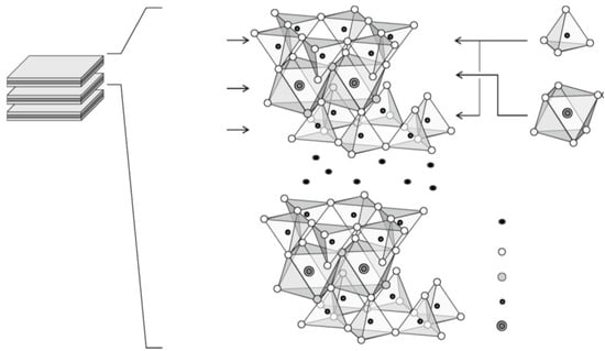 Montmorillonite (MMT) is a dioctahedral 2:1 phyllosilicate constituted by two tetrahedral sheets (T:O:T) and one octahedral sheet. The main characteristic of montmorillonite is the interlayer space which is present between each triple-sheet-layer (Figure 6). Furthermore, the triple sheet layers consist of isomorphic substitutions in the tetrahedral sheet of Si4+ by Al3+ and Al3+ by Mg2+ in the octahedral ones. This arrangement confers to montmorillonite a negative residual charge compensated by cations in the interlayer space. The interlayer space constitutes about the 90% of the total clay surface and, thus, it confers to the mineral the possibility to absorb water molecule or other compounds, which increase the adsorption capacity of the clay for polar molecules [2,52].