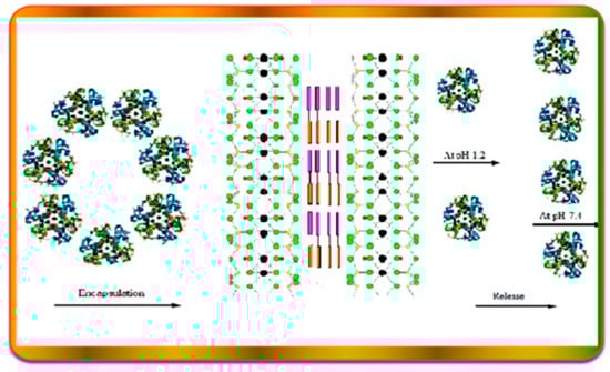 Turco Liveri et al. [69] reported the intercalation of metronidazole (MNE), an antibiotic commonly used for amoebiasis treatment, on MMT-K10 clay (a montmorillonite clay with a specific surface area of 250 m2 g−1). The authors found that the drug adsorption is strictly related to pH, and this process involves a multistep mechanism, where the drug can interact with the clay by protonation of the clay active sites, ionic exchange, and electrostatic interactions. Furthermore, the organic–inorganic hybrid composed by MNE/MMT-K10 allows for a sustained release of the drug in the gastrointestinal tract, protecting it by degradation, as highlighted by the in vitro kinetic study.