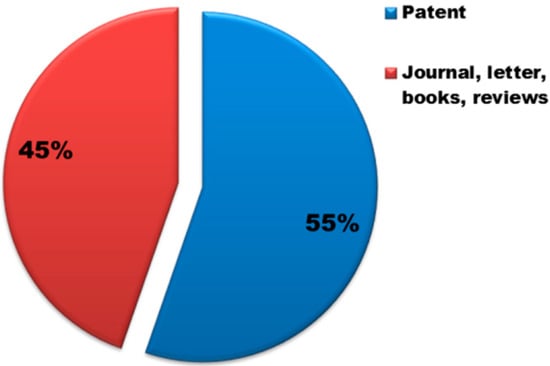 Distribution (%) of scientific publications in “patent” and “journal” for halloysite. Data analysis of publications, as of June 2018, was performed using the SciFinder Scholar search system using as “Document type” the “Journal, letter, book, reviews” and “Patent”, respectively.