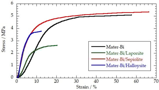 Figure 1 shows the stress–strain curves of pure Mater-Bi and the bio-nanocomposites with a nanoclay content of 30 wt %.