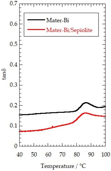 Figure 2. Dependence of tanδ on the temperature of Mater-Bi and Mater-Bi/sepiolite. The nanoclay content of the bio-nanocomposite was fixed at 30 wt %.