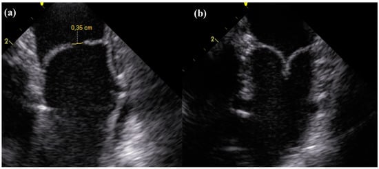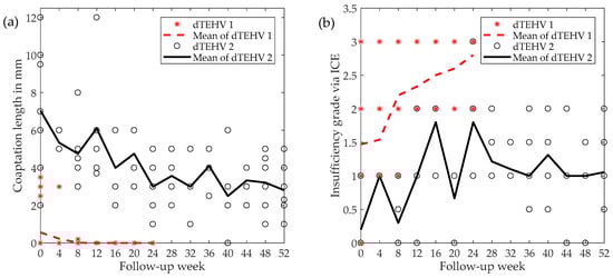 (a) Development of coaptation length during follow-up for dTEHV 1 and dTEHV 2 assessed via intracardiac echocardiography (ICE); (b) Progression of insufficiency grade via ICE for dTEHV 1 and dTEHV 2. Insufficiencies were graded according to the guidelines by the European Society for Cardiology [19].