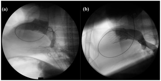 PA-angiography with the application of contrast medium directly after implantation of the dTEHV (Left: First generation dTEHV; right: Second generation dTEHV). (a) Insufficient closure of the newly implanted dTEHV 1—contrast medium regurgitates back into the RVOT; (b) Sufficient closure of the newly implanted dTEHV 2—no contrast medium regurgitates back into the RVOT or RV. Even the belly-shaped leaflets can be seen in the picture.