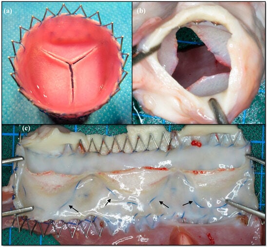 Macroscopic findings of the first generation dTEHV. (a) Stented dTEHV 1 before implantation; (b) Same dTEHV 1 after explantation. Central coaptation deficit is clearly visible; (c) Same dTEHV1 after explantation cut open longitudinally. Leaflet shortening is present as the blue suture line (black arrows) marked the hinge region before implantation.