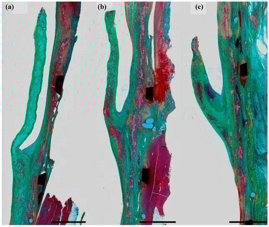 From left to right: Explanted leaflets of a dTEHV1 at 8 (a), 16 (b), and 24 (c) weeks after implantation. Progressive leaflet shortening is clearly visible. This figure was previously used by Schmitt et al. [16]. The polyglycolic acid (PGA) scaffold (light blue) was continually replaced by collagen ECM (green) and muscular matrix (red). Black scale bar represents 2 mm.