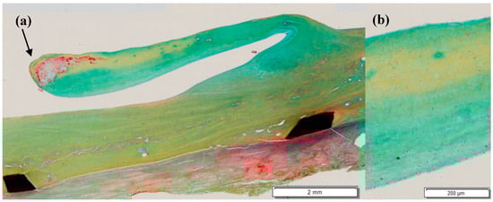 Movat’s pentachrome stain of an explanted dTEHV2. (a) Overview of the explanted valve. Remntants of the PGA-scaffold were found at the tip of the leaflet; (b) magnified section of the middle part of the leaflet. A multylayered mircostructure is visible.