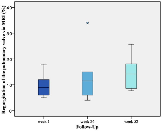 Progression of Regurgitation fraction assessed via MRI for dTEHV2. Regurgitation increased from a median of 9% (one week after implantation) to 14.7% 52 weeks after implantation (mean regurgitation fraction at 52 weeks was 13.9 ± 5.7%). n = 10 for week 1. n = 6 for week 24. n = 9 for week 52.