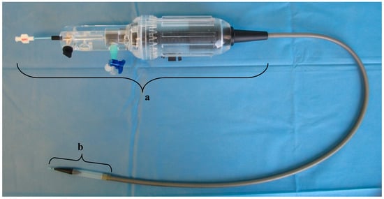 Delivery system designed for the deployment of the dTEHV. The handle is marked with “a”. At the tip of the delivery system lies the capsule in which the dTEHV can be loaded after crimping (marked with “b”). The middle part consists of a steel coil with an outer sheath made from a thermoplastic elastomer.