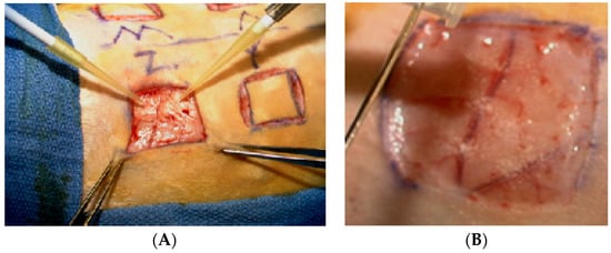 Full-thickness wound (A) adding the albumin scaffold (B) after scaffold crosslinking.