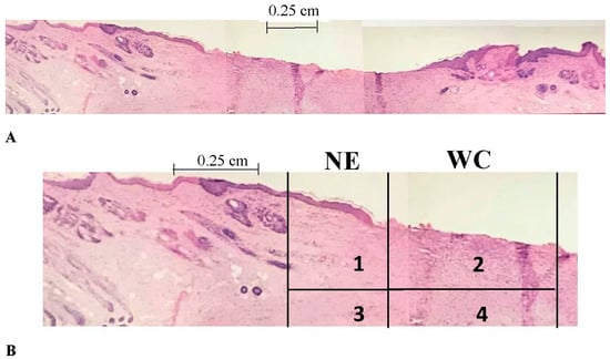 (A) A histology slide of the entire wound surrounded by the original skin; (B) Part of the same image with critical areas labeled. Area 1 and 3 are under the new epithelium (NE) and would be the outer part of the wound. The areas in the wound center (areas 2 and 4) would be considered the middle of the wound.