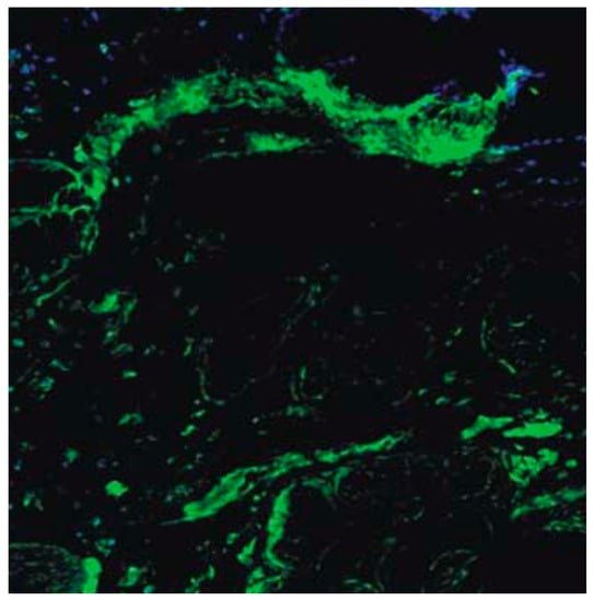 Imaging of mesenchymal stem cells (MSCs) transplanted in the wounds. Shown is a representative fluorescence microscopy image of MSCs (green) after three weeks in vivo.