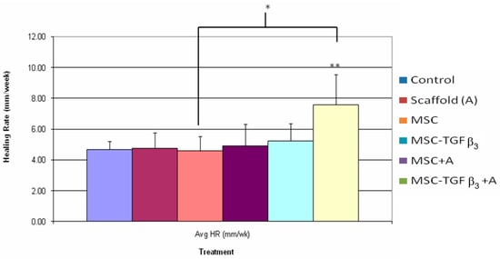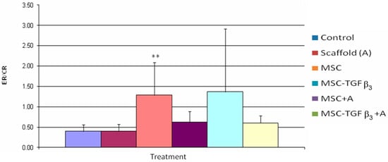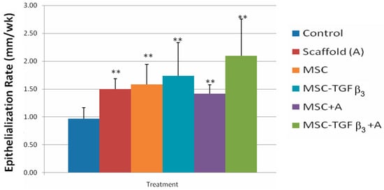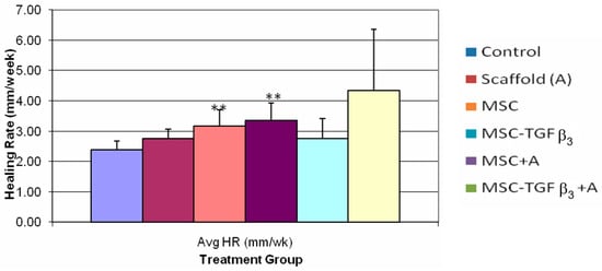 Figure 5 shows ER at two weeks following surgery. Wounds treated with MSC-TGFβ3-A showed the greatest increase over the control (117% increase, p = 0.008). Wounds treated with A (scaffold only) (55%, p = 0.004), MSC-A (47%, p = 0.005), MSC (64%, p = 0.01), and MSC-TGFβ3 (80%, p = 0.02) all had significant increases in ER as compared to the control. No other statistically significant differences in ER were observed between the treatment groups.