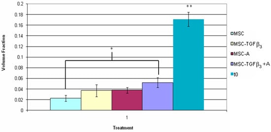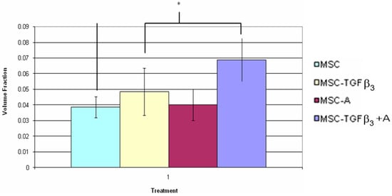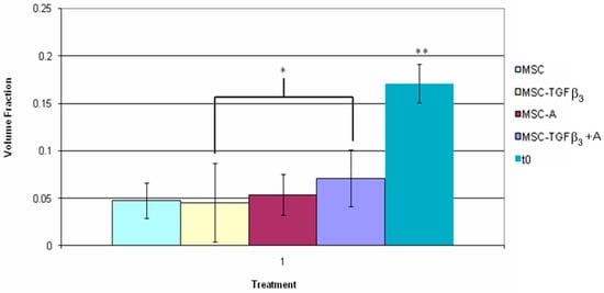 Table 3 shows the results of the volume fraction of fluorescent cells found within the wound edges one week following surgery. At this time point, no significant differences were observed. Figure 11 shows the volume fraction of fluorescent cells found within the wound edges two weeks following surgery. Wounds treated with MSC-TGFβ3-A showed a significant increase in fluorescent cells compared to MSC-A treated wounds (78% increase, p = 0.02) as well as MSC treated wounds (71% increase, p = 0.015).