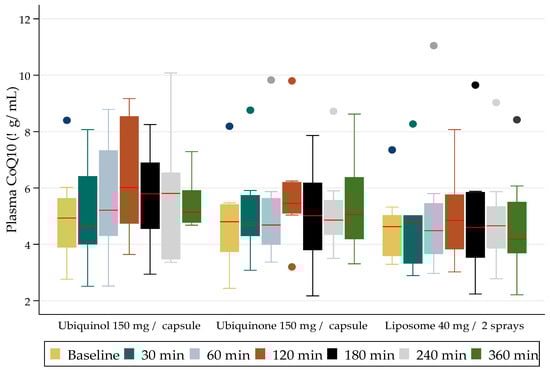 The demographic variables were represented as means of the standard deviation (SD). The CoQ10 values determined in the plasma comprised a continuous variable, and, given that the data were skewed and not normally distributed, the results were presented as medians (interquartile ranges). The results were graphically represented as box plots in order to demonstrate the changes in the plasma levels of CoQ10, from baseline through to 30, 60, 120, 240, and 360 min post administration of the controlled investigational dose of a CoQ10 formulation. Nonparametric tests (Kruskal-Wallis) were used to assess whether there were significant association effects present from baseline to six hours for the three different CoQ10 formulations administered.