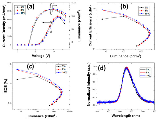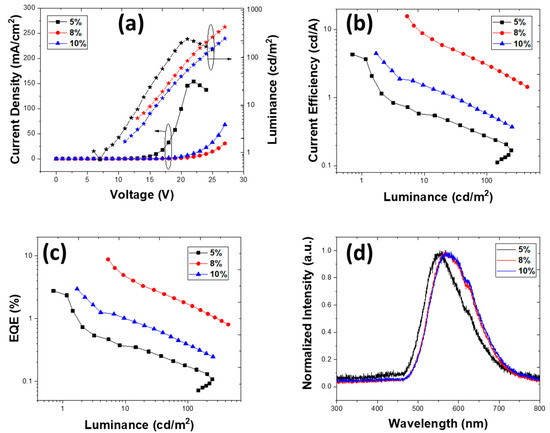 Device characteristics for structure ITO/PEDOT:PSS (40 nm)/PVK:OXD7:TXO-TPA (x wt.%) (40 nm)/TPBi (40 nm)/LiF (1 nm)/Al (100 nm) deposited from chlorobenzene. (a) Current density vs. voltage vs. luminance, (b) current efficiency vs. luminance, (c) EQE vs. luminance, and (d) electroluminescence spectra for 5, 8, and 10 wt.% (at 14 V).