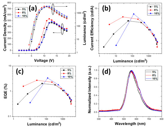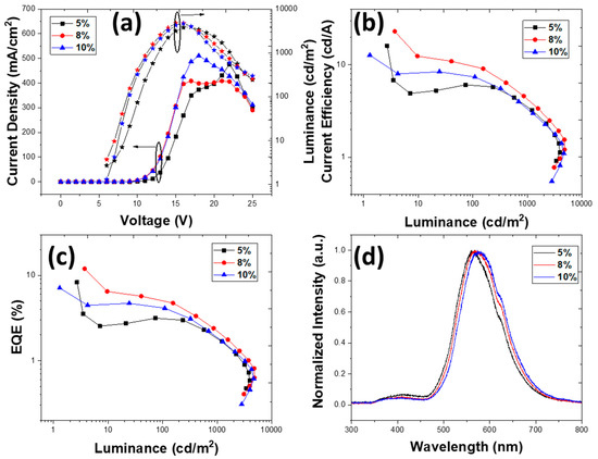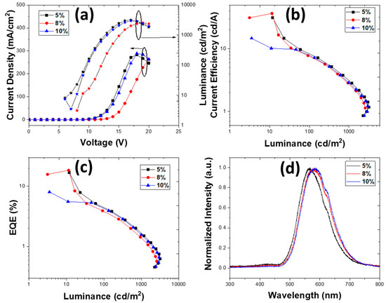 Upon changing the thickness of the EML, the device performance decreased drastically (Figure S3, Supplementary Materials). When the EML thickness was increased to 50 nm, a lower EQE of 15.33% was observed in the 8 wt.% device, while in the 5 and 10 wt.% devices it was also reduced to 10.6% and 6.14%. No further changes in EL spectra were observed. This reveals that in thicker EMLs, the electrical charge carrier profile led to a more electrically unbalance device, with further non-ideal recombination profiles reducing the radiative recombination probability. When the EML thickness was reduced to 25 nm, the EL spectra exhibited a blue-shift to 565 nm [40,41]. The devices with 5, 8, and 10 wt.% exhibited EQEs of 10.39%, 8.72%, and 7.99%, respectively. All the device characteristics are shown in Figure S4 of the Supplementary Materials.