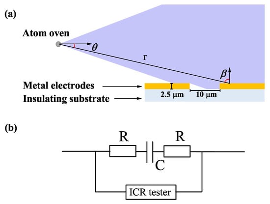 Our ion loading scheme is shown in Figure 1a and is widely used in surface ion traps [,,,,], in particular traps made of non-silicon substrate materials. Atoms leave the atomic oven with a solid angle and form an atomic beam, which sweeps across the surface ion trap, resulting in adsorption of some atoms on the surface, hence contaminating the trap. Numerous studies indicated that trapped ions suffer from the effect of surface adatoms [,,,], which will influence the ion trapping stability. Figure 1b shows a circuit diagram of a surface ion trap. Here, capacitance between the two adjacent electrodes is monitored when the atomic oven is turned on.