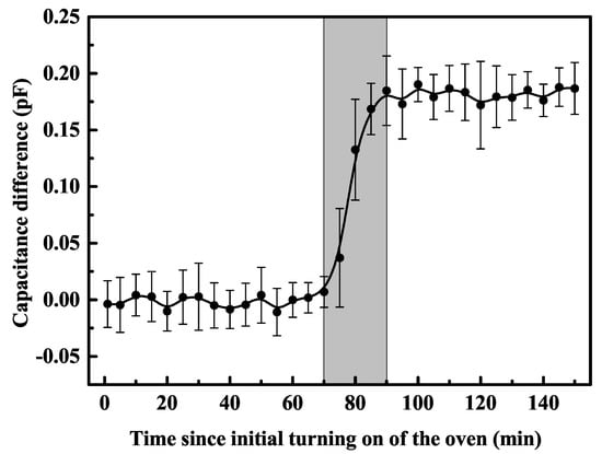 Variation of the capacitance from ten identical trap samples measured over time after turning on the atomic oven, under the Ca vapor pressure Pa and temperature 700 K of the atomic oven. The values of the data points are the average of ten trap samples’ capacitances starting when the oven was turned on ( min) and continuing after the oven was turned off at min. After the oven is turned off, the vacuum returns to Pa. The maximal capacitance difference is approximately pF.