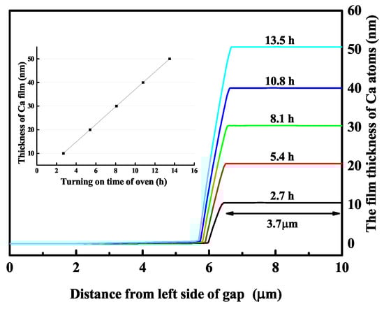 (Color online) The different adatoms’ thicknesses on the electrode gap are calculated at Ca vapor pressure Pa and the temperature 900 K of the atomic oven. nm thick films are generated by turning on the atomic oven for h, and the widths of these adatoms films are approximately m. The different thicknesses of the adsorbent layer are linearly dependent on the exposure time to the atomic beam in the illustration.