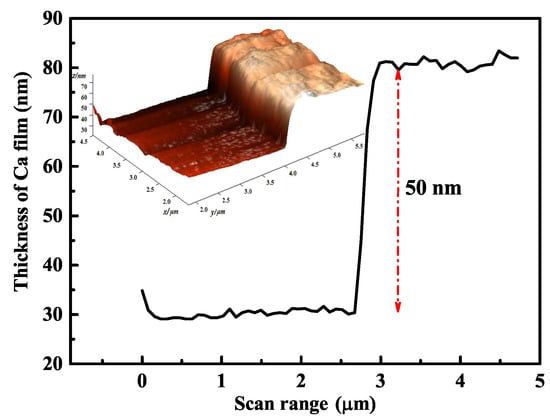 (Color online) The 50 nm thickness of the adsorbed atom film on the gap of electrodes tested by AFM, which comes from the AFM 3D image. There is a sharp increase at the m position of the scan range, signifying the edge of the Ca atomic film.