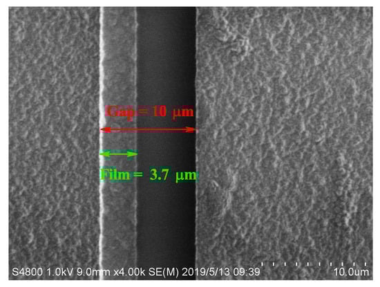 To compare with the simulation, we performed the surface adatoms’ experiment for h, with parameters consistent with those of the simulation. The sample covering the Ca film was tested using AFM with Ca film thickness of approximately 50 nm, as shown in Figure 4. Because of the limited measurement range of the AFM, the entire electrode gap could not be scanned. The SEM image of the trap surface showed that the m-wide gap of the electrodes was covered by m wide Ca film that connected to one side of the electrodes, as shown in Figure 5. These results agreed with the simulation, demonstrating the reliability of our calculation. Changes in capacitance between the electrodes was simulated using COMSOL software (version 5.1, Stockholm, Sweden) for electromagnetic analysis. Based on the geometry of the RF electrode and the ground electrode on the silica substrate, the capacitance was simulated with 1 V applied to the RF electrode and the ground electrode at 0 V. The simulated capacitance difference with and without the m wide adatom film was pF, consistent with our experimental results.