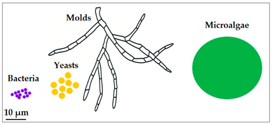 During the period of 2016–2022 the global nanomaterials market is expected to grow with a compound annual growth rate of about 20% or more [1]. One of the major challenges for the global advancement of nanomaterials market is the environmental sustainability of nanomanufacturing processes. Indeed, traditional top-down or bottom-up chemical and physical nanomanufacturing approaches have a greater energy-intensity compared to manufacturing processes of bulk materials. Further, they are often characterized by low process yields (using acidic/basic chemicals and organic solvents), generation of greenhouse gases, and they require specific facilities, operative conditions (e.g., from moderate to high vacuum), and high purity levels of starting materials [2,3,4]. The principles of green chemistry (“the invention, design and application of chemical products and processes to reduce or to eliminate the use and generation of hazardous substances”) combined with white biotechnology (“biotechnology that uses living cells—yeasts, molds, bacteria, plants, and enzymes to synthesize products at industrial scale”) can really contribute to the development of more sustainable industrial processes [5], also for nanomanufacturing. The microbial-mediated biosynthesis of nanomaterials is a promising biotechnological-based nanomanufacturing process that represents a ‘green’ alternative approach to physical and chemical strategies of nanosynthesis [6,7]. The microbial-mediated biosynthesis of metallic (also as alloys), non-metallic, or metal oxides nanoparticles have been reported for many microbial strains of bacteria, yeast, molds, and microalgae [8] (Figure 1).