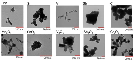 TEM observations revealed a majority of the metal and metal oxide particles to be approximately spherical with primary sizes ranging from 10 to 250 nm, Figure 1 and Table 2. Main outliers in primary size were observed for NPs of Mn3O4, V, V2O5, Sb and SnO2. The Mn3O4 NPs comprised smaller cubic particles (similar to observations for the other NPs) and long rods with a length scale up to 8 µm. Rods (nm-sized) were the predominating shape for the V NPs. The V2O5 and the Sb NPs had irregular shapes and primary particle sizes up to 1.2 µm. The SnO2 NPs formed aggregates of individual particles sized 2–3 nm. Compositional information of the outermost surface (oxide particles) and surface oxide (metal particles) of the NPs is given in Table 2 based on XRD, Raman, and XPS findings based on [25,26,27,28,29,30,31,32,33,34] (see supporting information, Figures S1–S3). The main surface oxides observed for the metallic NPs were in general similar to observations for the corresponding bulk metal oxide with the exception for the Mn NPs (Table 2).