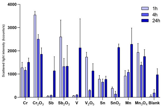 Changes in scattered light intensities for the different metal and metal oxide NPs after 0, 2, and 24 h of exposure in cell medium recorded by means of PCCS. Particle loading: 100 µg/mL; Blank cell medium only without any NPs. The error bars represent the standard deviation based on three independent samples.