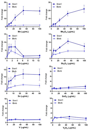 The most frequently activated reporter was the Srxn1-GFP reporter. The Srxn1 protein is involved in the reduction of hyperoxidized peroxiredoxin and regulated by the nuclear factor (erythroid derived 2)- like 2 (NRF2) transcription factor, which plays a key role in the oxidative stress response and regulation of various antioxidant gene networks [8,9]. Of the NPs tested, Mn and Mn3O4 NPs caused by far the largest activation of the Srxn1-GFP reporter resulting in around 20-fold maximum increase compared with control (Figure 4). The Sn, Sb2O3 and Sb NPs were also active, inducing approximately a 7–10 fold increase (Figure 4), which is comparable to previous observations for Ni and NiO NPs [11], and for Co and CoO NPs [12]. Some induction (2.5 and 2.7-fold) was also observed for the V2O5 and Ag NPs, respectively (Figure 4 and Supplementary Table S1).