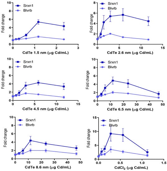Oxidative stress GFP-reporter activation in response to CdTe QDs of various sizes and CdCl2. ToxTracker reporter activation in live cells was measured as GFP-fluorescence using flow cytometry. The Srxn1-GFP reporter is Nrf2-associated, while the Blvrb is Nrf2-independent. The results are presented as mean ± standard error of the mean of three or four independent experiments (n = 3–4).