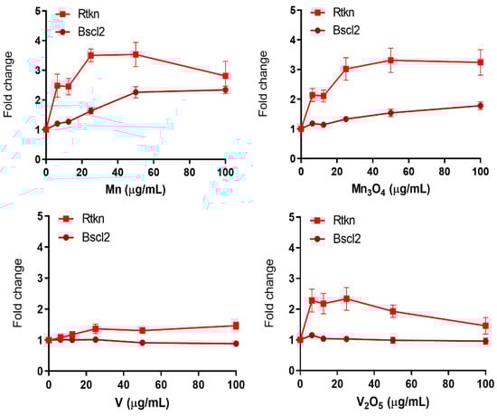 In general, few NPs induced reporters related to DNA damage (Figure 6). The Rtkn-GFP marker is associated with the NF-Kb cytokine signaling pathway, which further has been associated with activation of the ATM DNA damage kinase [8]. ATM is rapidly activated upon induction of DNA-double strand breaks and directly phosphorylates both CHK2 checkpoint kinase and p53 tumor suppressor resulting in inhibition of cell cycle progression, activation of DNA repair or inducing apoptosis. The Mn and Mn3O4 NPs were found to induce Rtkn at all doses tested (6.25–100 µg/mL) with a maximum increase corresponding to 3.5 and 3.3-fold, respectively (Figure 6). A marginal increase was also observed in response to V2O5 NPs, although at rather cytotoxic doses (40–50%), whereas no induction was observed for the V NPs (Figure 6). In our previous studies, CuO (unpublished), Co, and CoO NPs [12] as well as welding fume NPs [13] have activated the Rtkn reporter at magnitudes ranging from 2 to 3-fold increase. A slight increase (above 1.5-fold) was also observed for Cr2O3 NPs, as also previously observed for Ni and NiO NPs [11].