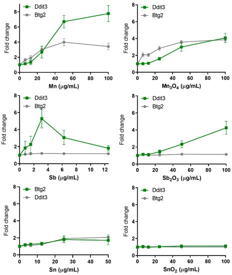 The unfolded protein response (UPR) is an additional pathway associated with carcinogenicity. Ddit3 (DNA damage-inducible transcript 3) is a transcriptional factor associated with multiple functions such as cell cycle arrest, apoptosis and endoplasmic reticulum (ER) stress. It further encodes the transcription factor CHOP, which has a vital role in the response to a wide variety of cell stressors following ER stress [8]. The Mn NPs revealed the strongest induction of the Ddit3-GFP reporter, with a maximum of almost 8-fold increase (Figure 7). This is equivalent to the maximum fold induction of Ddit3-GFP historically observed for ToxTracker [8]. This high increase was followed by the Mn3O4 and Sb2O3 NPs, both inducing a 4-fold increase, as well as the Sn NPs with an increase marginally exceeding the 2-fold threshold (Figure 7). No increase was observed in response to the SnO2 NPs (Figure 7). Exposure to Sb NPs further resulted in an increase of the Ddit3-GFP reporter, reaching a 2 to 5-fold increase, although results exceeding the 2-fold level were observed at viability levels less than 25% (Figure 7).