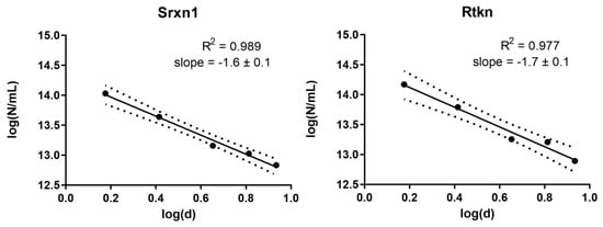 Equi-response curves for CdTe QDs (1.5, 2.6, 4.5, 6.5, 8.6 nm) representing a 20% reduction in cell viability compared to control for Srxn1 and Rtkn reporter. Slopes are plotted according to the model proposed by Delmaar et al. [24] where N denotes the number of particles and d the diameter of the particle.