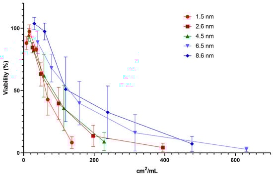 Further, the exposure dose (μg/mL) of the QDs was converted to surface area (cm2/mL), based on supplier’s information, which was plotted against viability for all 5 sizes of QDs (Figure 10). The results showed similar and somewhat overlapping curves for the two largest sized particles (8.6 and 6.5 nm), and similarly the curves of the QDs with size of 4.5 and 2.6 nm, respectively, were comparable. The smallest QDs tested resulted in a somewhat steeper curve compared to the larger sizes. These results support the conclusion of surface area being a good dose metric for QDs, but also indicates that the smallest QDs (1.5 nm) could have additional toxic effects not entirely explained by the larger surface area.