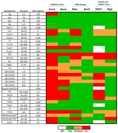 Taken together with previous data published on ToxTracker findings, the results on the different NPs (n = 33) show a great diversity in activation of GFP-markers as well as in magnitudes of induction, as visualized in Figure 11. This indicates that ToxTracker is a sensitive method for mechanistic screening of NPs and thus able to distinguish differences in toxic effects between various NPs tested. It is evident that the oxidative stress related reporters are the most frequently induced with 20 out of 33 different NPs investigated inducing the Srxn1-GFP reporter. The following NPs clearly induced (exceeding the 2-fold threshold) the Rtkn DNA damage reporter: CuO, Co, CoO, CdTe QDs, Mn, Mn3O4, V2O5, and welding NPs. Some induction (>1.5-fold, but less than 2-fold) of the Rtkn reporter was also observed with the Ni, NiO and Cr2O3 NPs. We suggest that the NPs activating Rtkn reporter are of particular concern when considering genotoxicity of metal- and metal oxide NPs. Ten of the investigated NPs (CdTe QDs, Mn, Mn3O4, Sb, Sb2O3 and Sn) also induced the Ddit3-GFP reporter, supporting protein stress as a possible mechanism behind their toxicity.