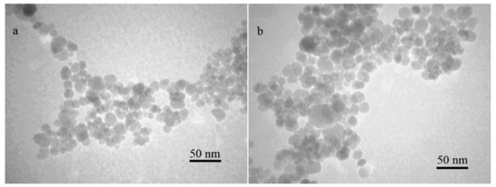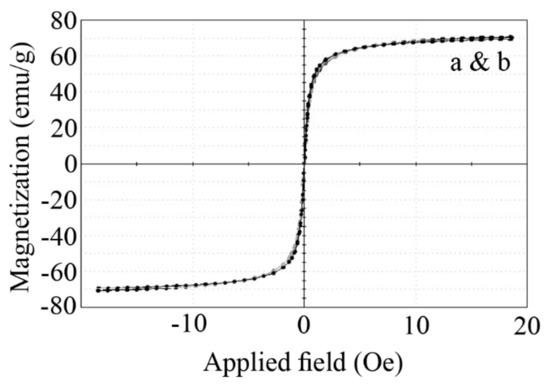 The magnetization curves of naked and APTES-coated nanoparticles showed no hysteresis and were completely reversible (Figure 6). No coercivity and reduced remanence were observed, which indicates the superparamagnetic nature of the nanoparticles. The saturation magnetization was recorded to be 70.492 and 69.598 emu/g for naked and APTES-coated particles, respectively. These results were in close agreement with previous reports that the APTES coating has no significant effect on the magnetic properties of MNPs [36,37,38].