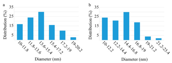 A TEM micrograph of the prepared nanoparticles is provided in Figure 1. The particles were found to be spherical in shape, with a narrow particle size distribution. The diameter of the naked particles ranged from 10 to 20 nm, with 14 nm being the mean particle size (Figure 2a). Meanwhile, APTES-coated particles showed a slight increase in size and measured to be 10 to 22.5 nm in diameter, with a 14.7 nm mean size (Figure 2b). This increase in size cannot be considered as significant and based on previous reports that APTES coating would not significantly increase the particles size distribution and mean particle size [33,34,35].