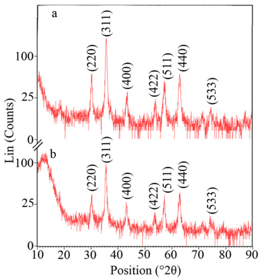 XRD patterns of naked (a) and APTES-coated (b) MNPs indicating the characteristic diffraction pattern of magnetite crystals.