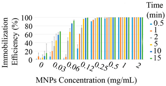 The efficiency of magnetic immobilization to harvest yeast cells was evaluated in various concentrations of MNPs. Immobilized cells were exposed to a magnetic field (1.4 T neodymium magnet) for various time periods and the immobilization efficiency was calculated via Equation (1):