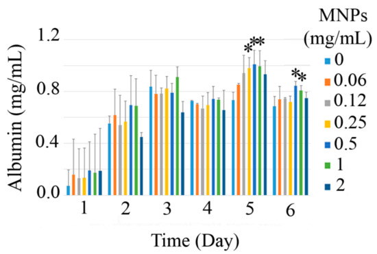 The employed P. pastoris cells for the production of recombinant HSA were strain GS115 Albumin (genotype His4, phenotype Muts), which has an HSA gene under the high-inducible PAOX1 promoter. The promoter is induced by methanol, and albumin production occurred over 5 days. In this experiment, the potential of the free and immobilized P. pastoris cells for HSA production was monitored over 6 days of induction with methanol, and the results are depicted in Figure 8. It can be seen that HSA production is completed after 5 days of induction in all cells. Compared to the free cells, magnetic immobilization with 250 μg/mL to 1 mg/mL nanoparticles increased the efficiency of P. pastoris cells for HSA production (p < 0.05). The largest increase in HSA production (38.1%) was achieved by the cells that were immobilized with 500 μg/mL of nanoparticles. This is the first time that we can achieve a higher production in the immobilized P. pastoris. In previous experiments, cells were immobilized in a polymeric matrix, and a significant reduction in cell performance and production was inevitable [12,13,15,16].