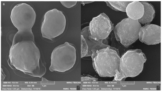 The interaction of MNPs with P. pastoris cells was visualized by SEM analysis, and the micrographs are provided as Figure 9. Free cells can be seen by the smooth surface (Figure 9a) while cells decorated with MNPs provide a rough surface appearance for the cells (Figure 9b). These results revealed the potency of the prepared nanoparticles to immobilize yeast cells efficiently.