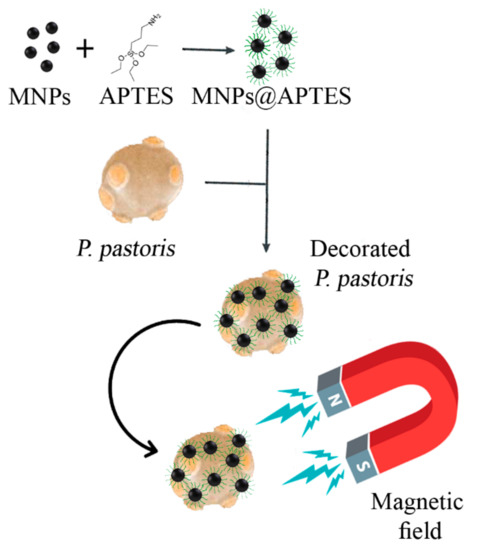 Decoration of P. pastoris cells with APTES-coated MNPs (MNPs@APTES) to make the cells magneto-responsible.