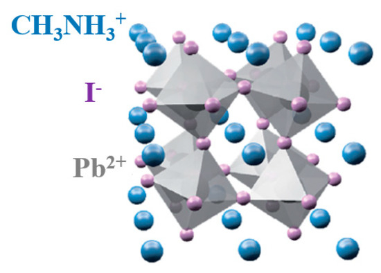 According to literature, lead-based HOIPs (MAIPb) has achieved the best efficiency among all the studied hybrid perovksites [27,28,29,30,31]. In MAIPb, A-site is occupied by methyl ammonium cation (CH3NH3+), the B-site by lead cation (Pb2+), and the X-site by iodine anion (I−) (Figure 1) [32,33].