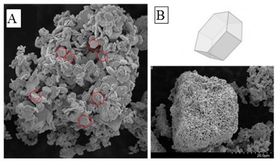 The morphology of the material was investigated with SEM, the results, shown in Figure 2A,B, suggest an aggregation of nanoparticles with hexagonal shape domains with nanometers size. The specific morphology of the crystal lattice is mainly influenced by the synthesizing temperature and may affect the optical, electrical, and transmission properties of the material, as confirmed in the study of Li et al. [47].