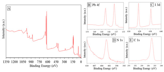 XPS measurements were performed in order to investigate the chemical bonding states of the element in the envisaged catalyst Figure 4A. According to Navas et al. [18], peaks at 143 and 138.1 eV can be assigned to Pb 4f (Figure 5B); peaks around 412 eV, showed in Figure 4B, were assigned to Pb 4d5/2. The bigger peaks can be associated with the Pb component in the halide hybrid perovskite structure, while the smaller to metallic Pb probability decomposed from PbI during the synthesis [63]. Peak corresponding to 401 eV peak were assigned to N1s Figure 4D. In accordance with the studies performed by Chen et al. [64], N state may vary and the associated peaks can be found at different BE. Different peaks positions were found in a range of 396–404 eV in agreement with Nakamura and Mrowetz et al. [65]. Conforming to the study of Navas et al. [18], the peaks shown in Figure 4C belong to I 3d3/2 and I 3d5/2. It was further shown that the spectrum shows well separated spin–orbit components, separation of around 11.4–11.5 eV was recorded as typical evidence of the presence of I−0 [18]. Figure 4E shows peak belongs to C1s around 285 eV. Shen et al. [54], in their interesting research on hybrid organic-inorganic perovskite for solar cell application, assigned this peak to the methyl group. The conclusion obtained here agrees well with that reported by previous literature confirming the achievement of the synthesis processes [18,63,64,65,66].