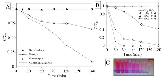 (A) Degradation of Rhodamine B (RhB) in dark condition, photolysis, photocatalysis, assisted-photocatalysis; (B) degradation of RhB under different H2O2 concentration conditions 10−4, 10−3, 10−5 mol∙L−1; (C) picture of color extinction of RhB as function of time.