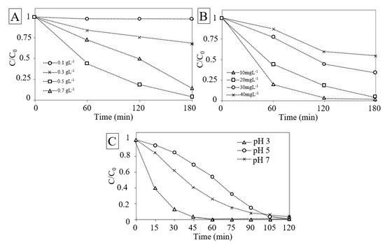 The effect of catalyst load on the ability to remove RhB in aqueous solution is shown in Figure 6A. The results suggest that the removal performance increased with the catalyst load up to 0.5 g∙L−1 and decreased when the load is higher. This is in agreement with the case observed in heterogeneous photo-catalysis reaction. This behavior can be rationalized both in terms of availability of active sites on material surface and light penetration of photo-activating light into the system. The availability of active sites increased with catalyst loading, but on contrary the light penetration and, hence, the photo-activated volume of particles decreased [80]. Moreover, higher amount of catalyst may induce the deactivation of particles by collision with ground state molecules reducing the rate of reaction [81]. The trade-off of these effects was studied by considering also the organic contaminant concentration.